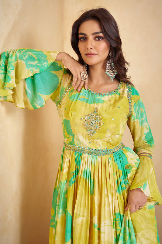 Yellow Anarkali Suit Flower Printed Long Dupatta Gown Dresses