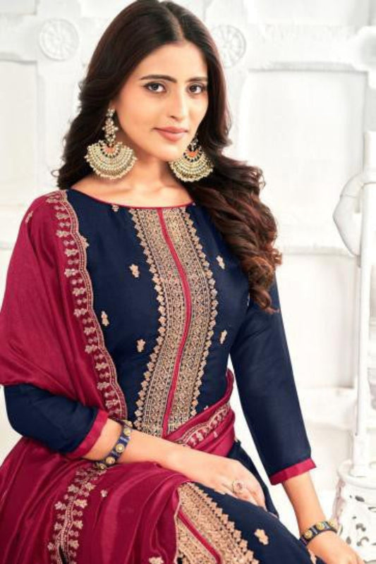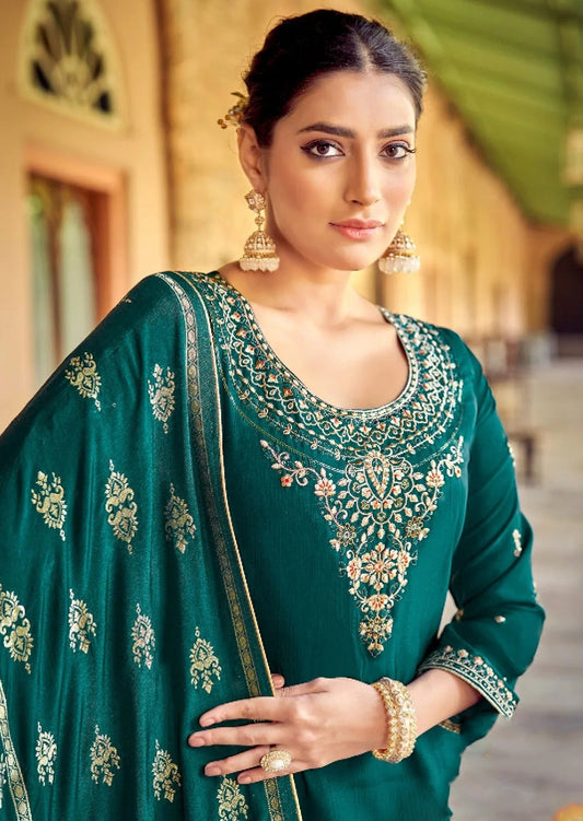 Ramdan Designer Teal Blue Embroidery Plazzo Suit With Jacquard Dupatta