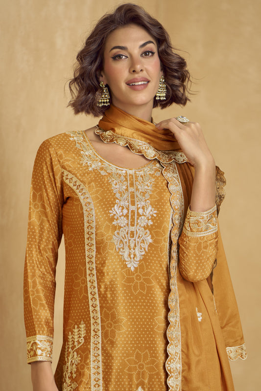Orange Chinon Silk Palazzo Suit With Embroidery Work