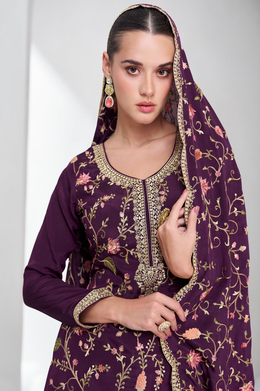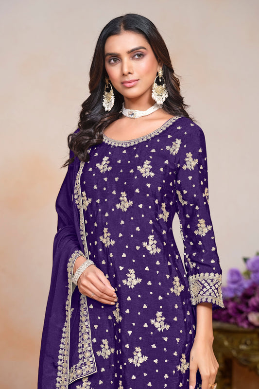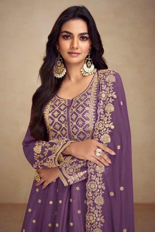 Elegant Purple Embroidered Chinon Silk Palazzo Suit For Festival