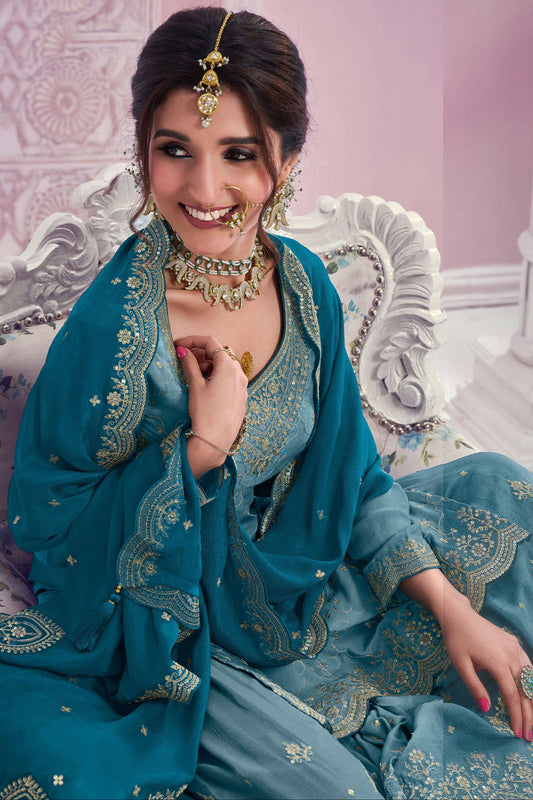 Premium Teal Blue Georgette Palazzo Suit For Wedding Function