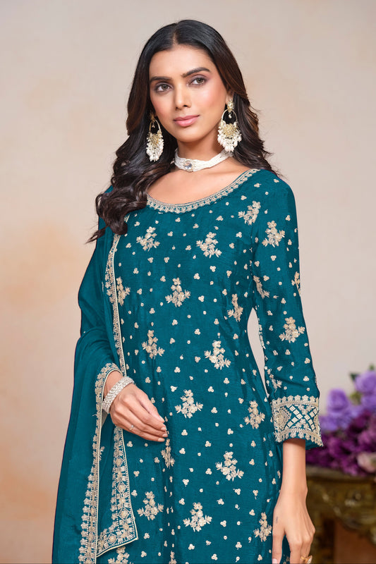 Luxury Teal Chinon Silk Palazzo Suit For Traditional Outfit