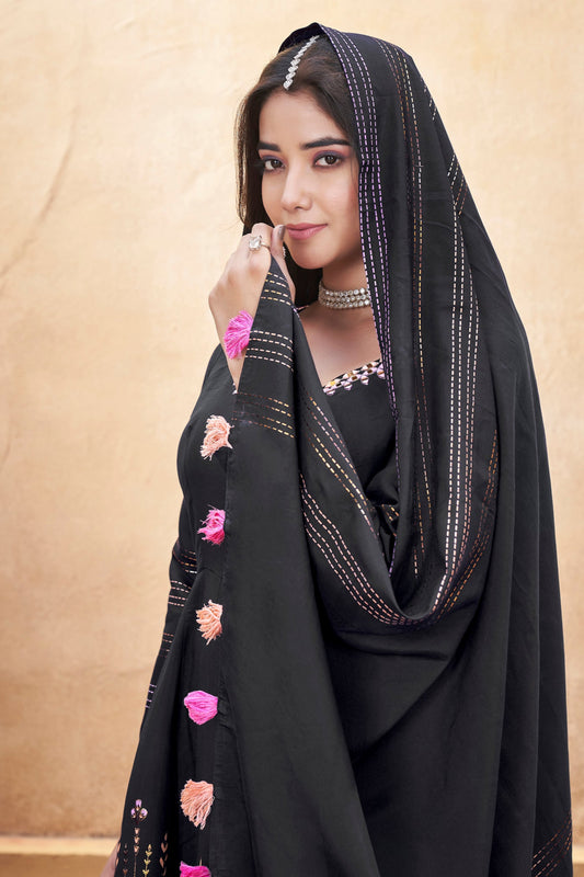 Elegant Black Roman Silk Embroidered Kameez with Salwar & Dupatta