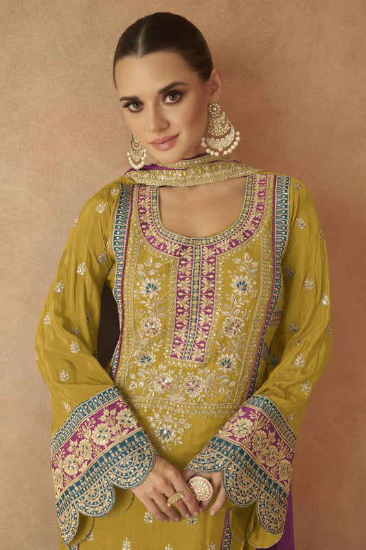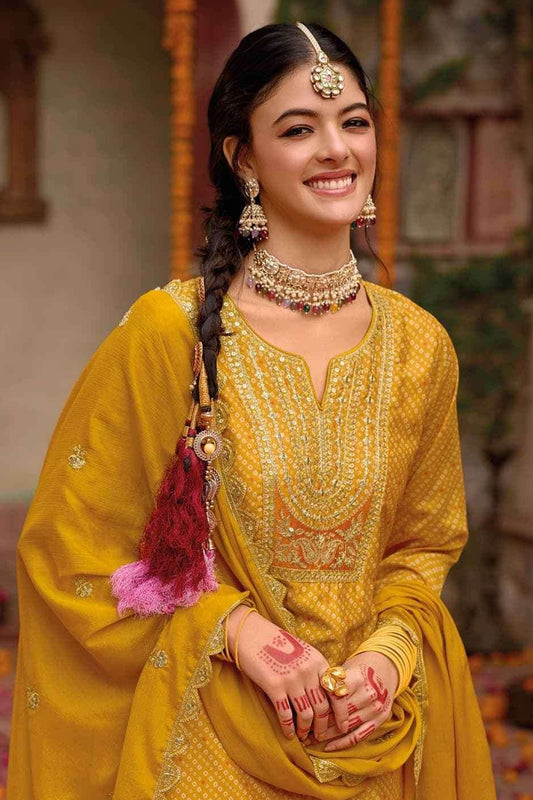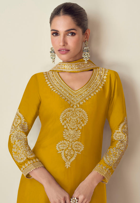 Fashionable Style Dark Yellow Embroidered Indian Ethnic Palazzo Dress