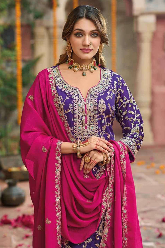 Stylish Purple Embroidered Palazzo Dress with Dupatta for Reception