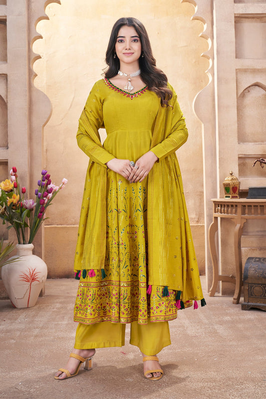 Fashionable Style Yellow Color Embroidery Work Palazzo Dress With Dupatta