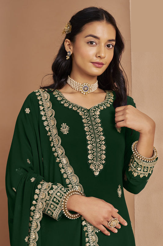 Embroidery Work Dark Green Palazzo Dress With Dupatta For Wedding