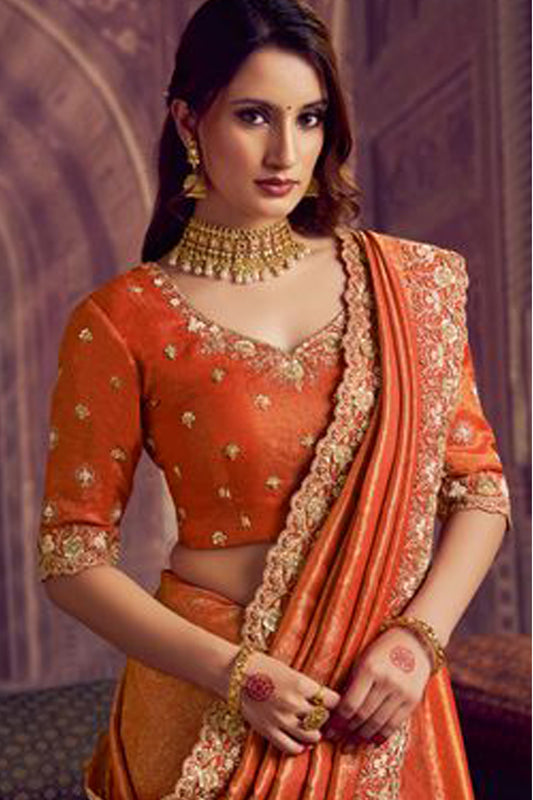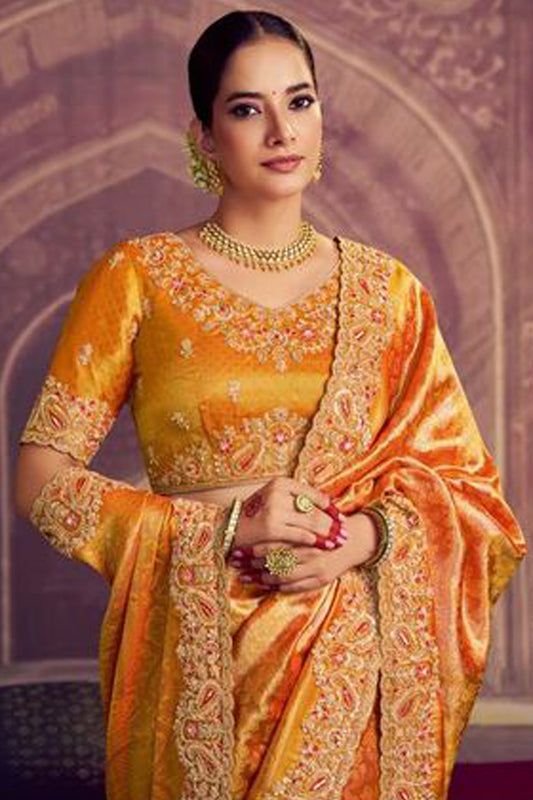 Wedding Wear Embroidery Worked Stylish Saree With Stitched Blouse
