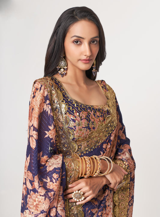 Gorgeous Designer Organza Fabric Blue Color Floral Printed Wedding Party Wear Saree