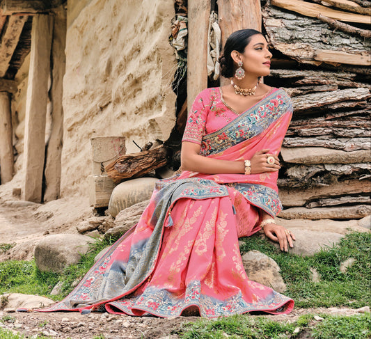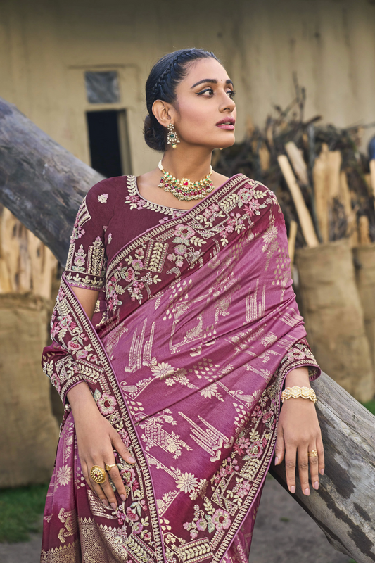 Brown & Pink Dola Silk Saree with Embroidery for Sangeet Night