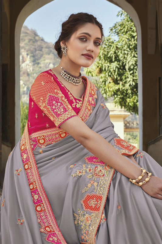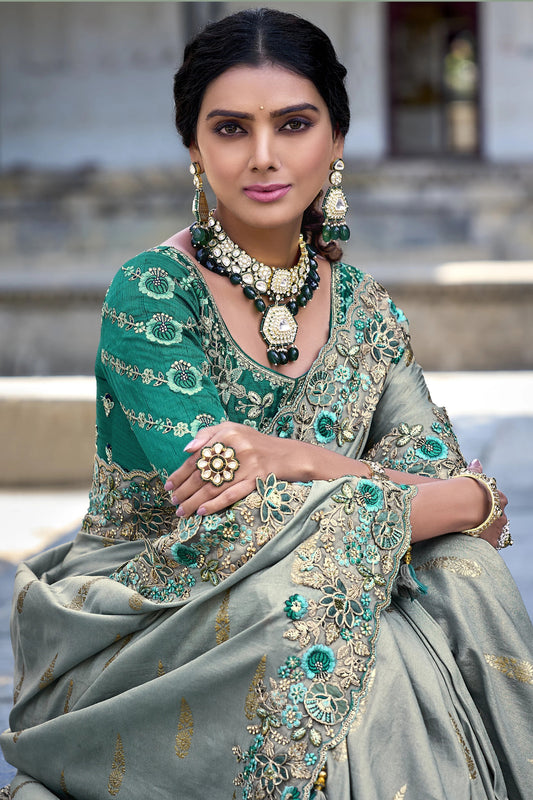 Grey Designer Traditional Saree with Fancy Silk & Handwork for Wedding