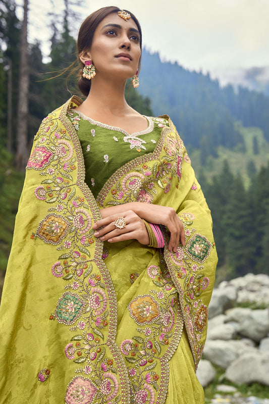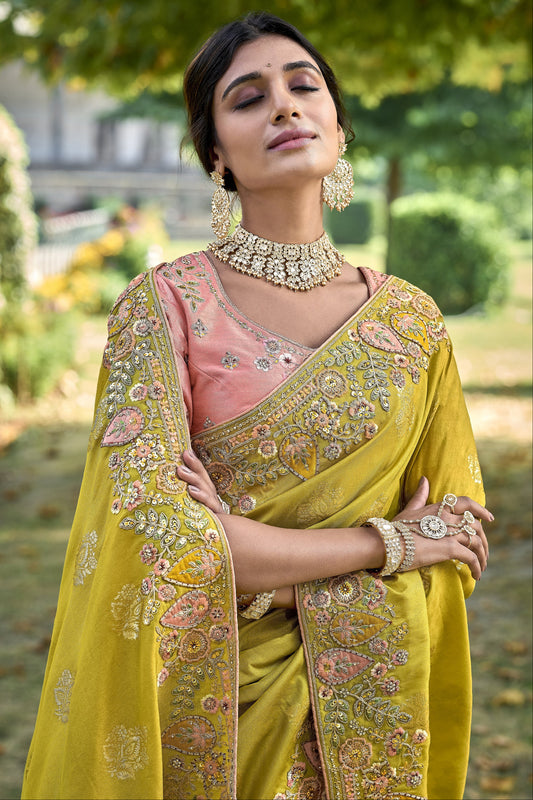 Lemon Dola Silk Saree with Embroidery & Patchwork for Occasions