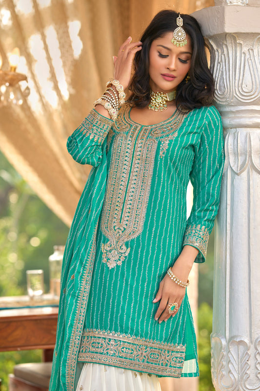 Designer Sharara Sets In Teal With Chinon Silk Elegance