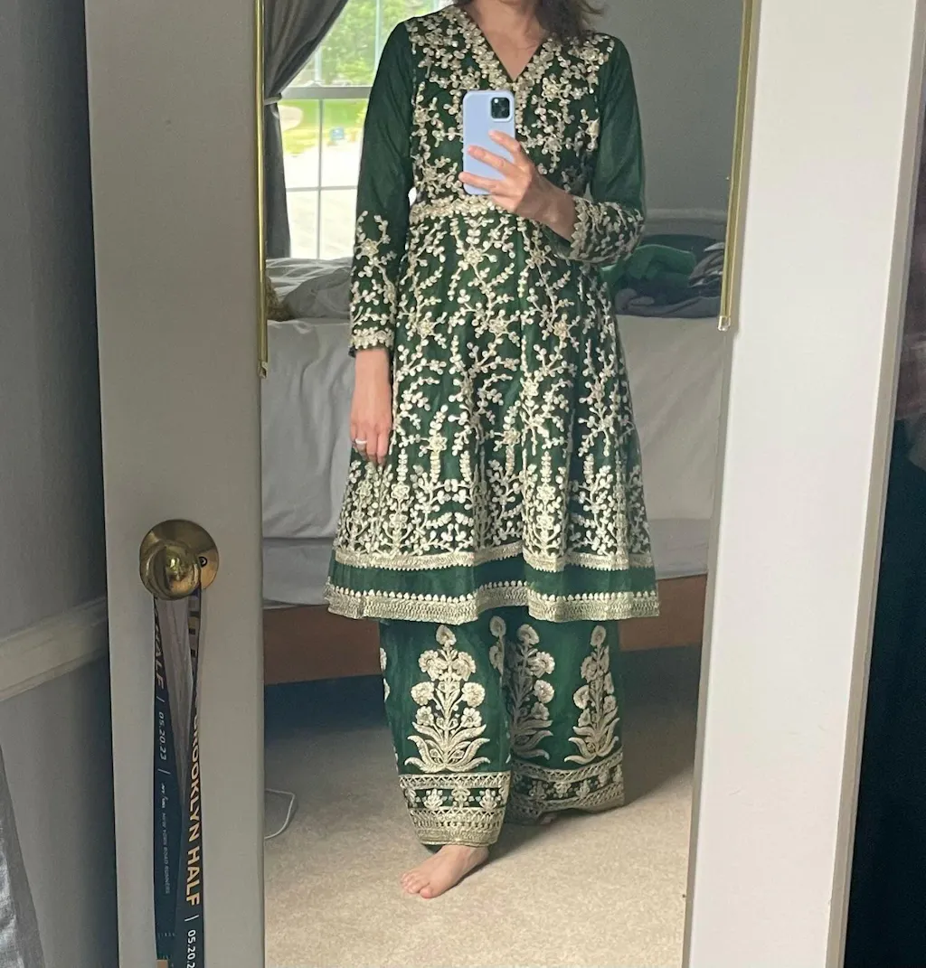 Elegant Green Palazzo Dress with beautiful embroidery and dupatta - the perfect choice for weddings, parties, and special celebrations. This stunning green net salwar kameez palazzo set showcases intricate heavy embroidery work and beautiful detailing that captures the essence of traditional Pakistani and Indian craftsmanship. The premium net fabric in elegant green drapes beautifully, creating a flowing silhouette that flatters every figure while ensuring all-day comfort during long celebrations.This beautiful piece of ethnic wear features stunning embellishments that create a captivating look. The flowing palazzo paired with a matching dupatta and embroidered kameez offers the perfect blend of traditional charm and modern designer style. Whether you're attending Pakistani and Indian weddings, bridal ceremonies, reception parties, roka celebrations, nikah events, Eid festivities, Diwali celebrations, or any special occasion, this readymade stitched Elegant Green Palazzo Dress ensures you make a memorable impression with grace at every event.