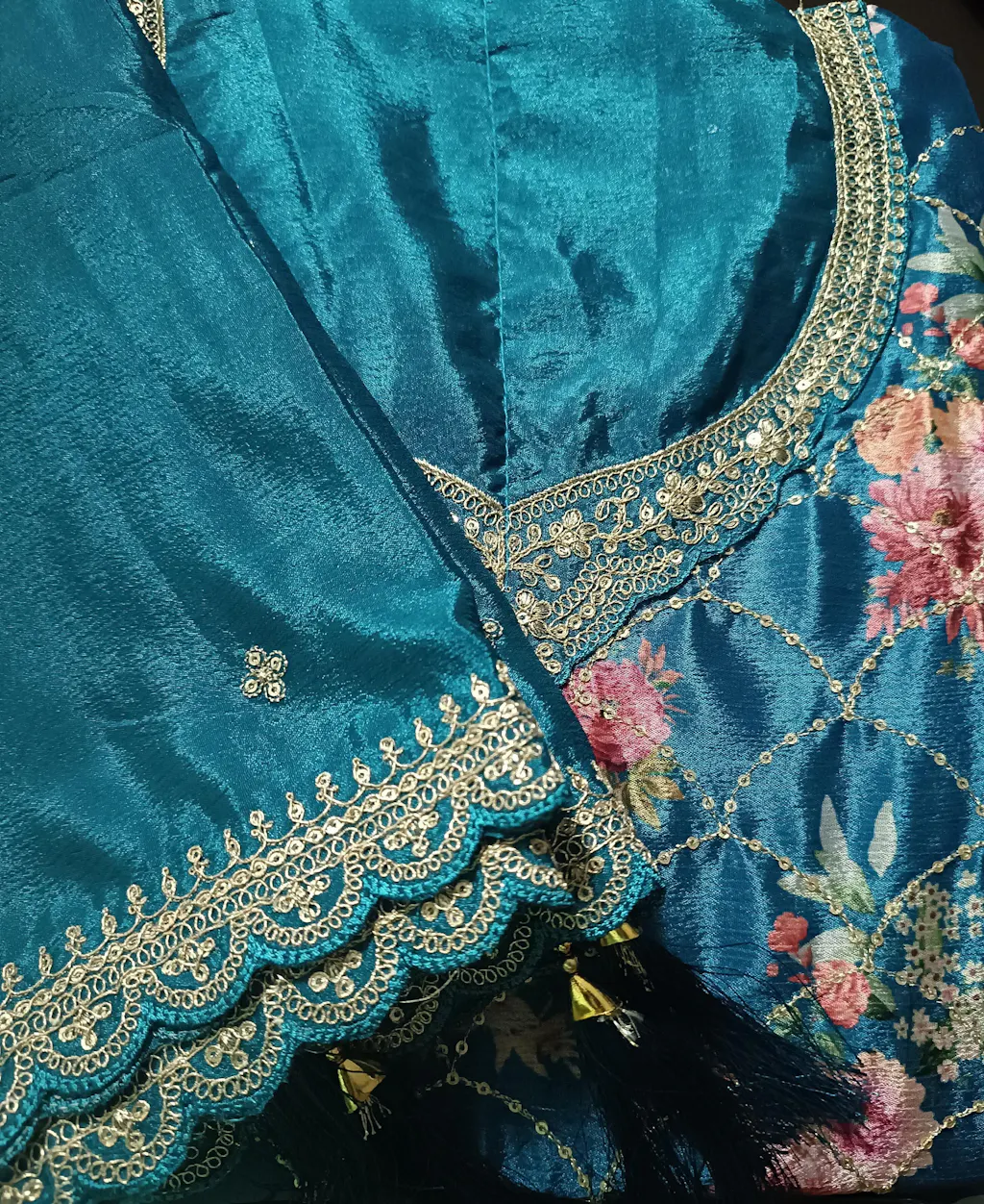 Teal Blue Chinon Palazzo with beautiful embroidery and dupatta - the perfect choice for weddings, parties, and special celebrations. This stunning teal blue chinon silk salwar kameez palazzo set showcases intricate embroidery work and beautiful detailing that captures the essence of traditional Pakistani and Indian craftsmanship. The premium chinon silk fabric in elegant teal blue drapes beautifully, creating a flowing silhouette that flatters every figure while ensuring all-day comfort during long celebrations. This beautiful piece of ethnic wear features stunning embellishments that create a captivating look. The flowing palazzo paired with a matching dupatta and embroidered kameez offers the perfect blend of traditional charm and modern designer style. Whether you're attending Pakistani and Indian weddings, bridal ceremonies, reception parties, roka celebrations, nikah events, Eid festivities, Diwali celebrations, or any special occasion, this readymade stitched Teal Blue Chinon Palazzo ensures you make a memorable impression with grace at every event.